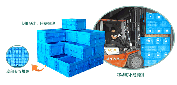 5、防滑防倒: 箱子底部交叉堆碼,卡扣設(shè)計(jì),任意疊放,防止箱子在移動(dòng)時(shí)因堆高而易滑倒